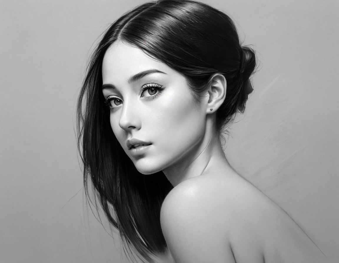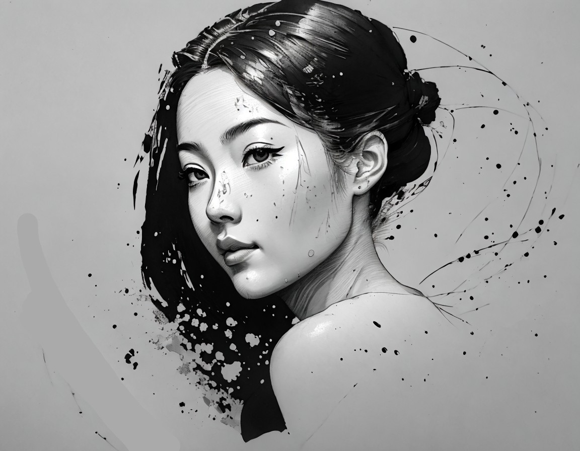 A stunning ink illustration of a young woman, showcasing her profile. The artwork features fluid brushstrokes and splashes of black, capturing her serene expression and elegant hairstyle.
