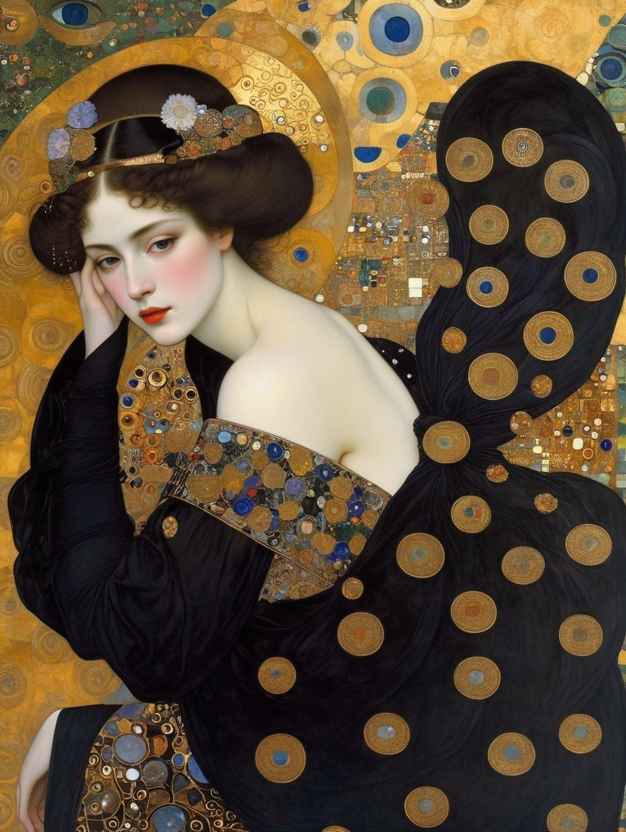 A painting of a pensive woman with a blue floral headpiece and a golden, ornately patterned cloak.