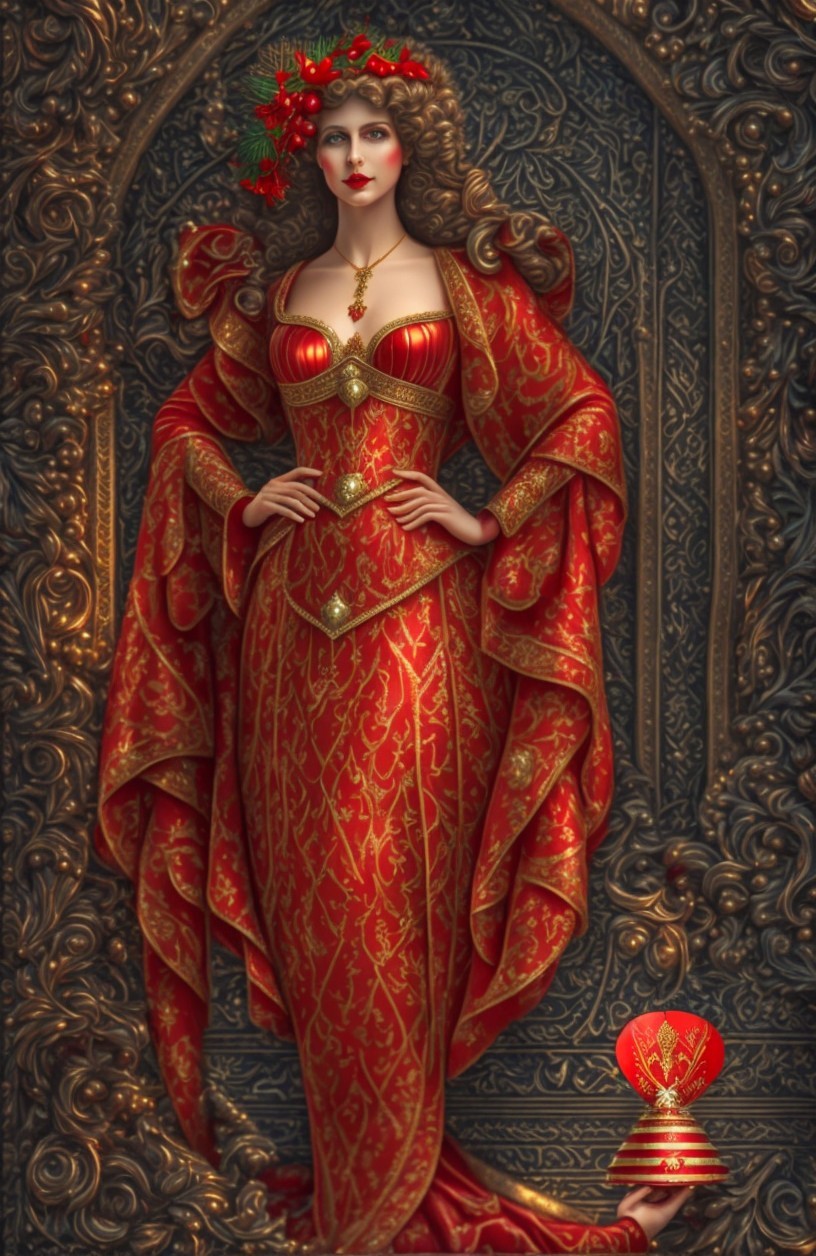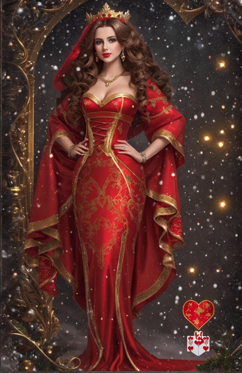 + Prompt:Make the Queen of Hearts on a playing card a Christmas Queen of Hearts. Beautiful Christmas atmosphere and warm red and gold colors, symmetrical, hearts.