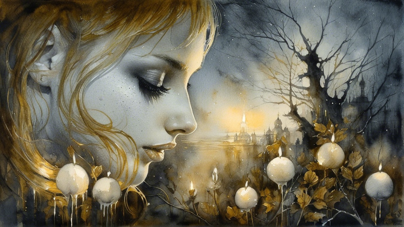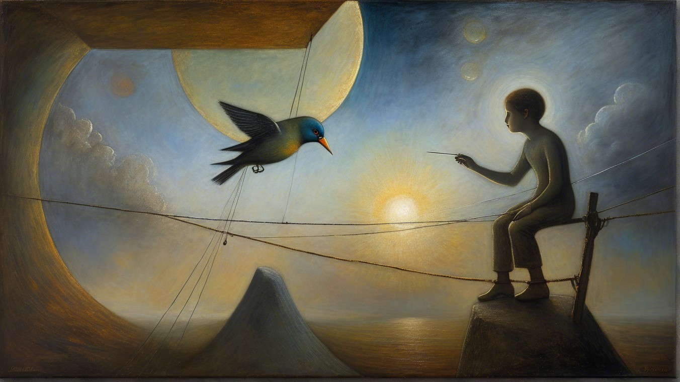 A serene scene depicts a figure sitting on a ledge, reaching out to a vibrant bluebird. Celestial bodies hover in a luminous sky, blending warm and cool tones, creating a dreamlike atmosphere.