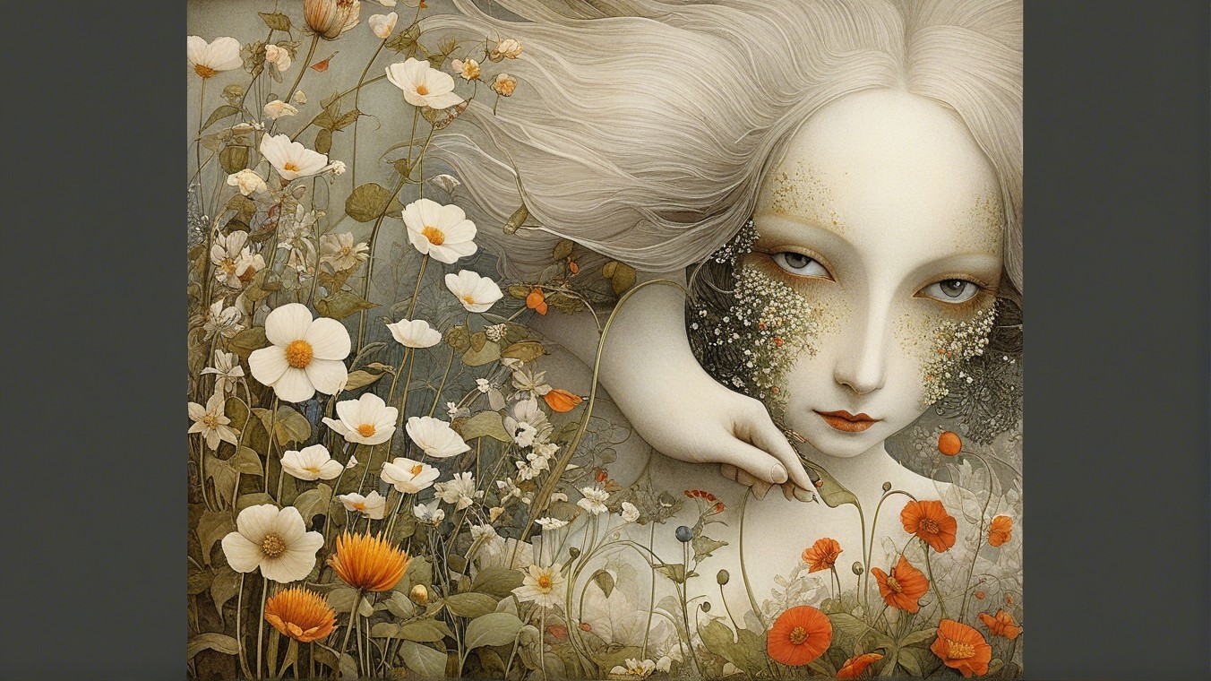 The image features two ethereal figures, one adult and one child, with striking pale skin and flowing hair. They are surrounded by lush flowers, creating a dreamy, surreal atmosphere.