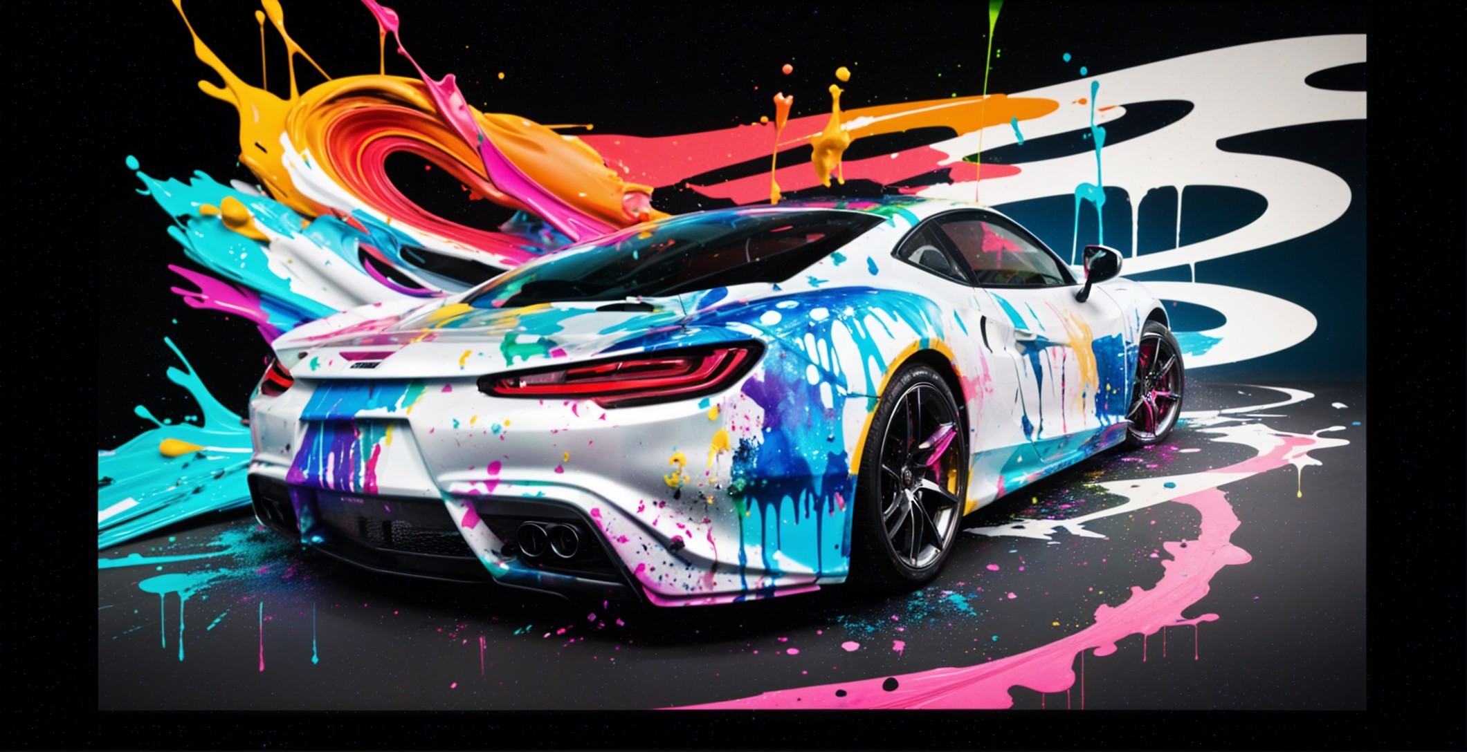 (Try from other user) - A sleek sports car features a vibrant graffiti-style wrap with splashes of bright colors, creating an eye-catching display against a contrasting dark background.