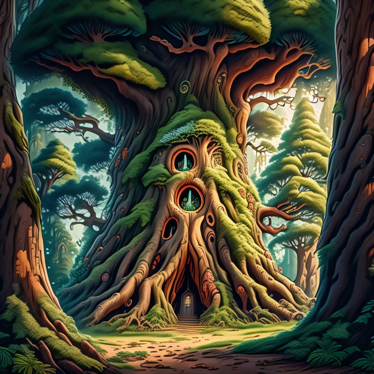 A vibrant, whimsical forest with mushroom-like trees, a path leading to a rounded door, and ethereal lighting.