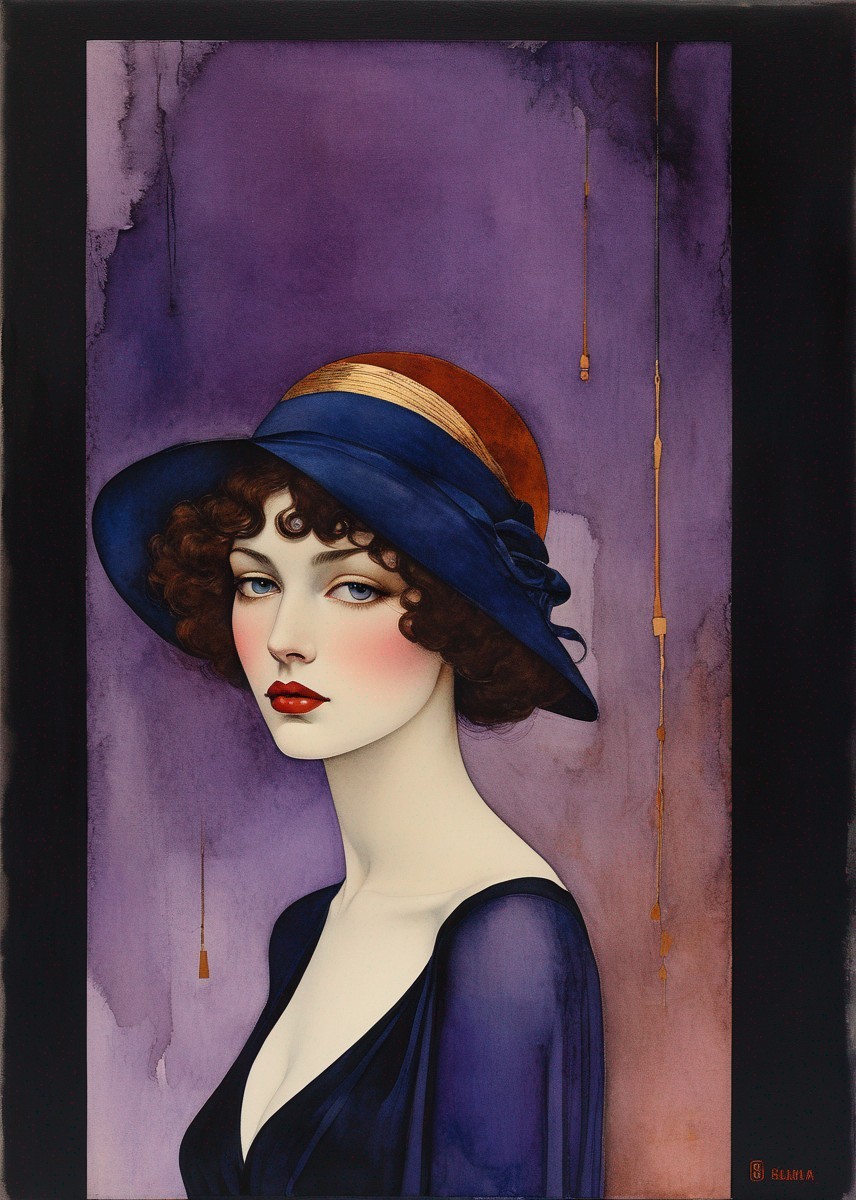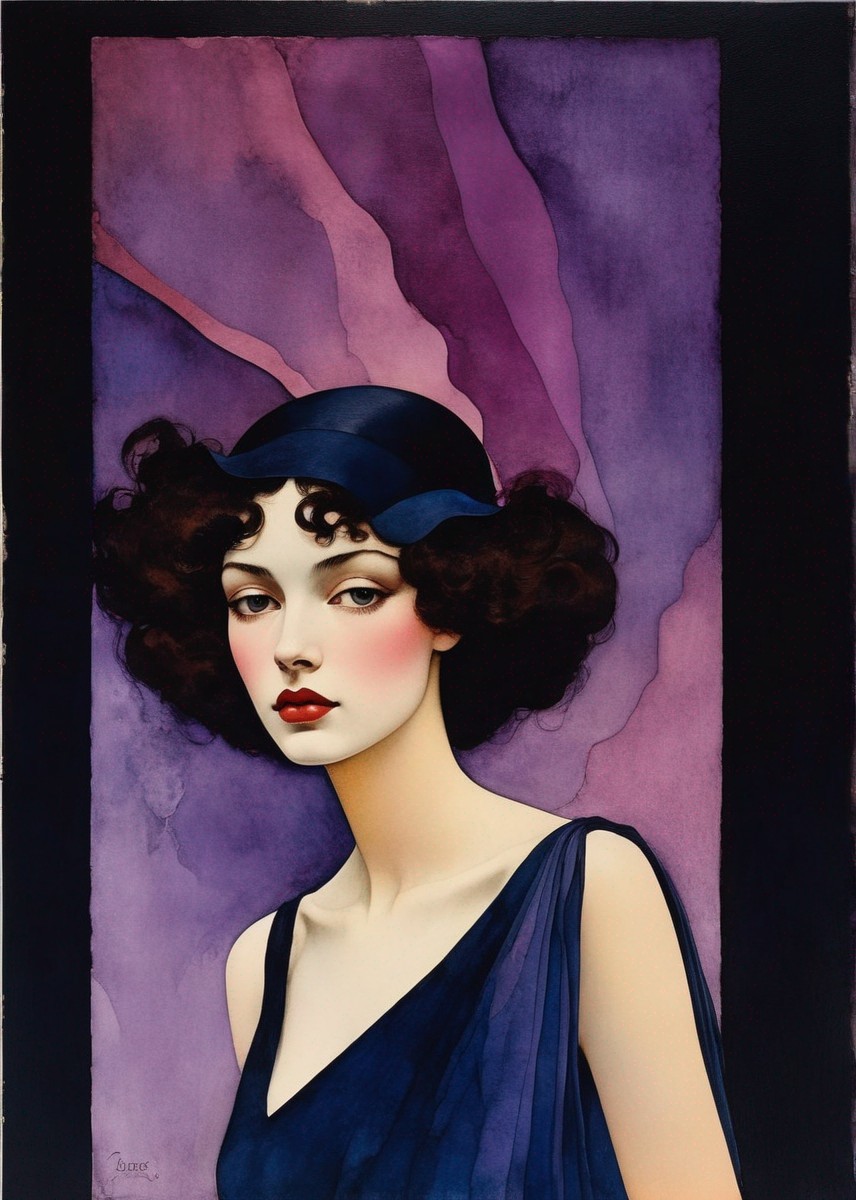 Beautiful dark woman in the style of WALTER MARTIN BAUMHOFER and rené gruauwhimsical, beautiful, poignant, touching. colors pink, violet, gold, rust, indigo, burgundy, black. soft watercolor extra water in Art Deco by Annigoni, Egon Schiele, Milo Manara, Botticelli, Catrin Welz-Stein, Jean Metzinger, Klimt, perfect eyes, perfect hands face , highly detailed, complementary colors, hyper detailed. Watercolor and ink splatter, dynamic pose,