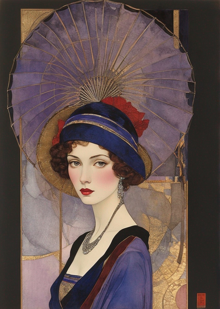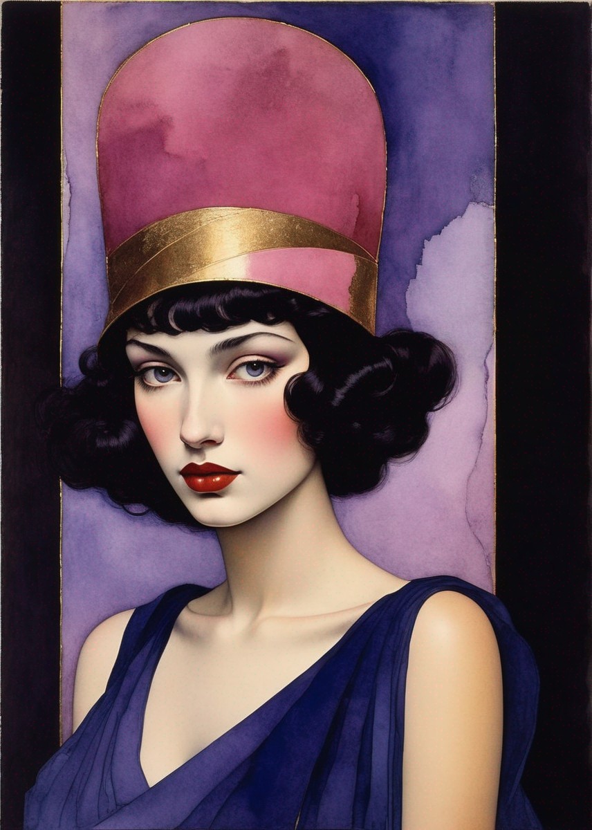 Prompt: Beautiful dark woman in the style of WALTER MARTIN BAUMHOFER and rené gruauwhimsical, beautiful, poignant, touching. colors pink, violet, gold, rust, indigo, burgundy, black. soft watercolor extra water in Art Deco by Annigoni, Egon Schiele, Milo Manara, Botticelli, Catrin Welz-Stein, Jean Metzinger, Klimt, perfect eyes, perfect hands face , highly detailed, complementary colors, hyper detailed. Watercolor and ink splatter, dynamic pose,