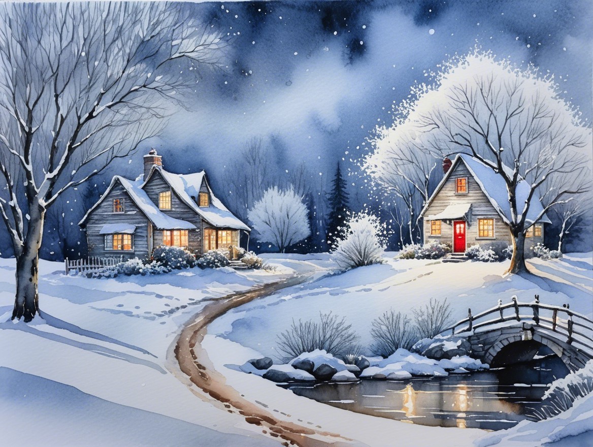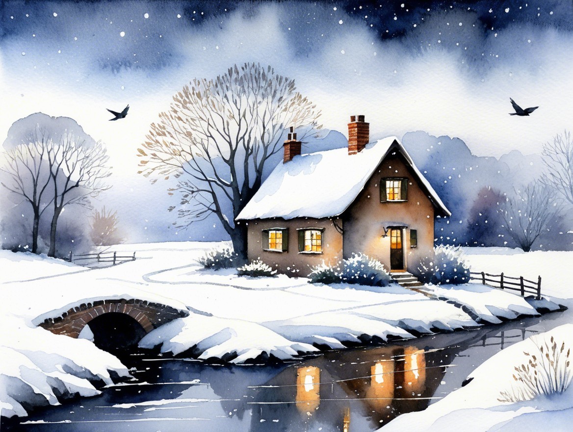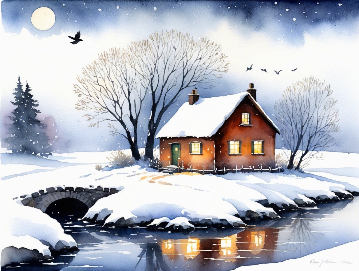 A cozy cottage in a snowy landscape, with warm lights glowing from the windows. The night sky features a crescent moon and scattered stars, surrounded by frosty trees and a serene atmosphere.