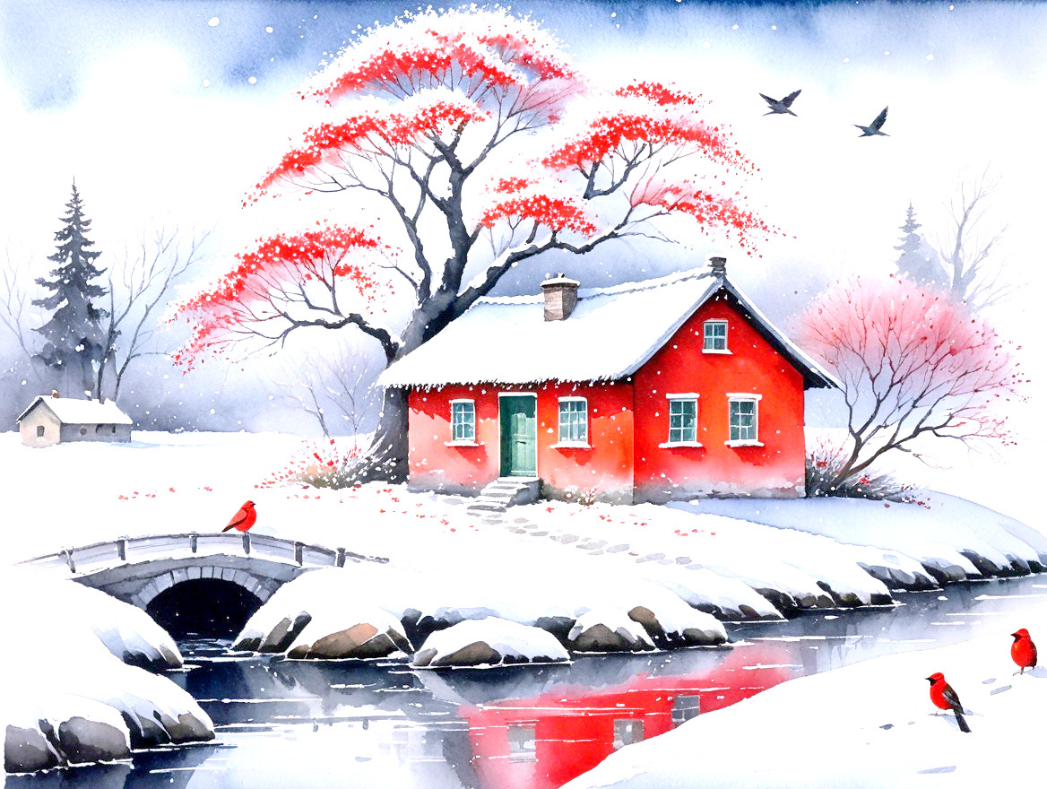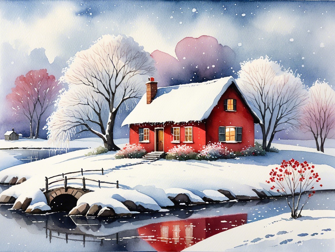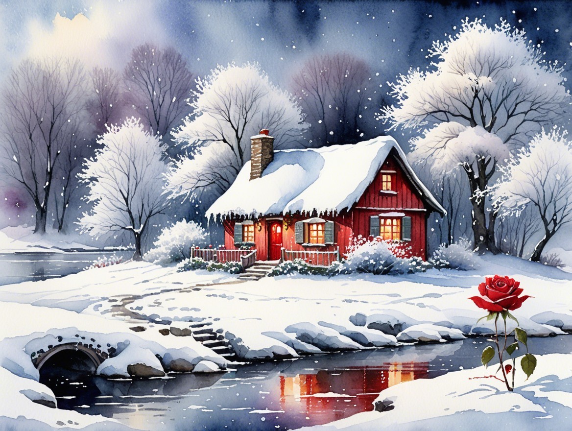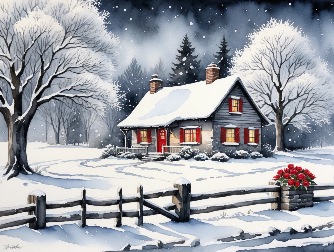 A cozy cottage in a snowy landscape, with warm lights glowing from the windows. The night sky features a crescent moon and scattered stars, surrounded by frosty trees and a serene atmosphere.