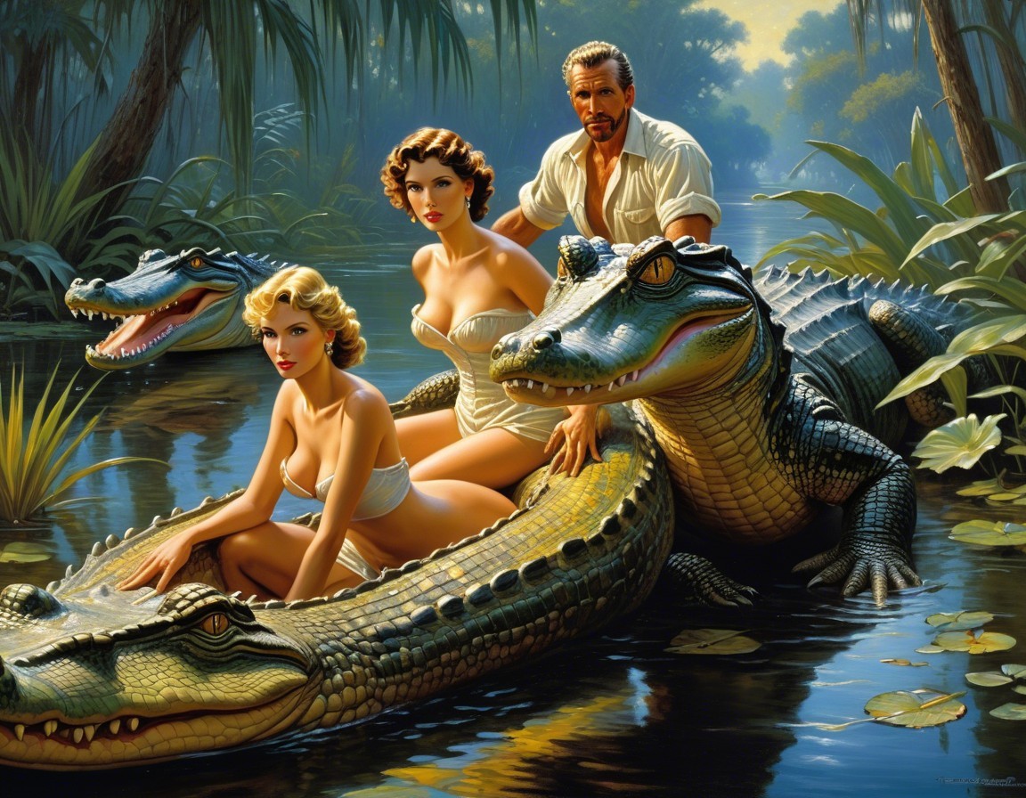 In a lush, tropical setting, a man and two women in vintage swimsuits ride on the backs of giant alligators through a serene swamp, surrounded by vibrant greenery and soft sunlight.