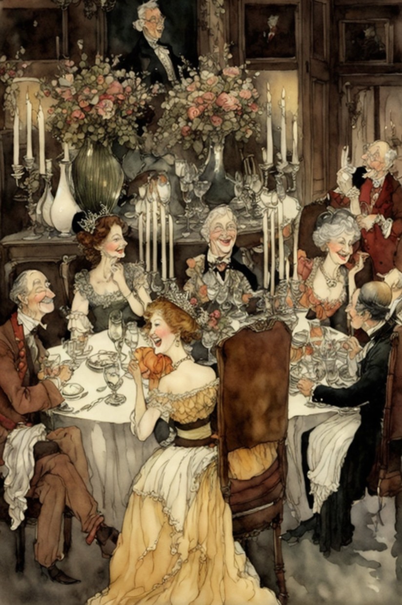 A vintage dinner party scene featuring elegantly dressed guests around a richly set table, sharing laughter and conversation, illuminated by candlelight and a warm atmosphere.
