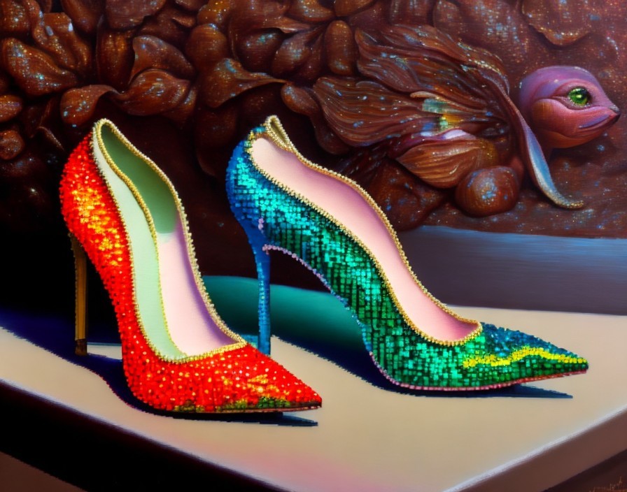 Colorful Rhinestone-Studded High Heels in Rainbow Gradient Displayed on Floral Background