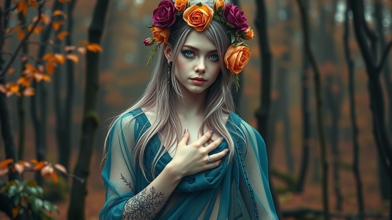 Adorning her head is a floral crown, composed of large, deep purple and vibrant orange roses, interspersed with delicate greenery and swirling vines. The crown adds a fantasy element to her character. Her body is partly obscured by a sheer, flowing garment in shades of teal, which drapes elegantly over her figure and features intricate beading along the edges.