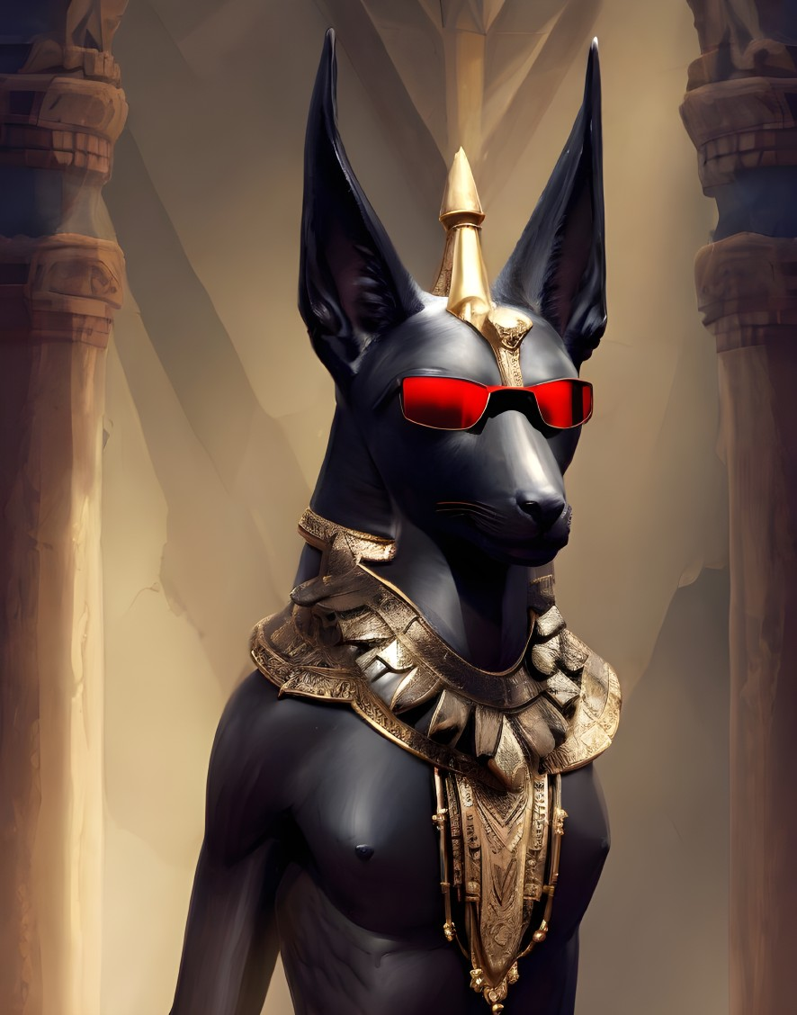 A stylized Anubis figure with red sunglasses and ornate gold neckpiece against a backdrop of pillars.