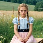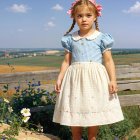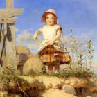 A young girl in a blue dress with a white collar stands in a field of tall grass and flowers, holding a bouquet in one hand and a wicker basket in the other, with a quaint house in the background.