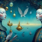 A dreamy surreal landscape features ethereal figures with intricate headpieces, floating orbs, and serene waters. The scene blends vibrant blues with delicate gold accents, creating a mystical atmosphere.