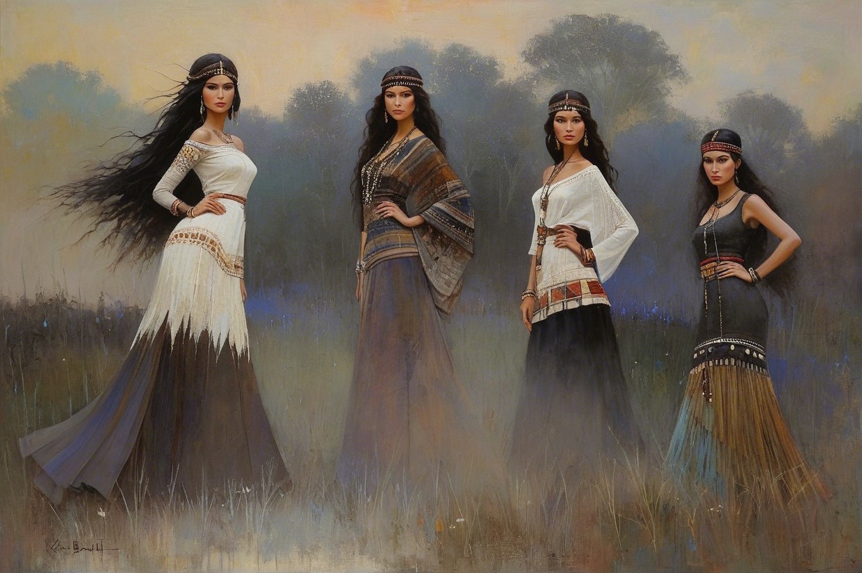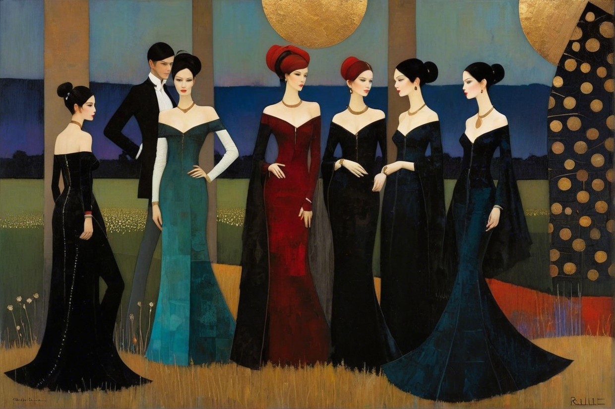 A striking artwork featuring six elegantly dressed women in colorful gowns, standing in a serene landscape with stylized trees and golden moons, exuding sophistication and grace.