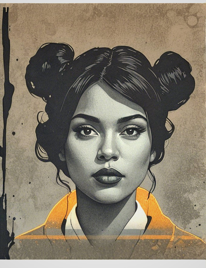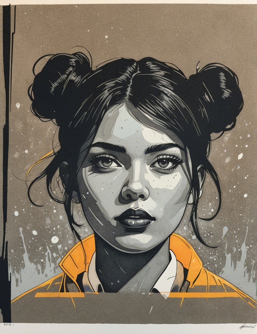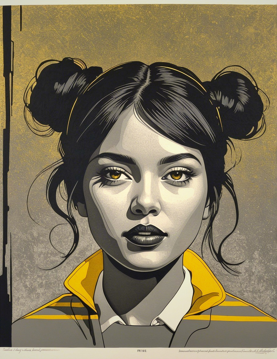 Linocut-inspired artwork, dynamic splash ink technique, aquatint fusion, triadic color scheme goldenrut-yellow dark-grey light-grey, mip-mapping 1.4, quaint, hues and tints by Ed Binkley and Paul Kidby, ultra-high definition, high dynamic range, intricate details, bold black ink, precise lines, watercolor blend, close-up composition, semi-cartoon aesthetic, ink and a scratching style, chiseled, multi-layered eyes. Several transparent crystal-clear layers. parallax occlusion 1.8, uhd, hdr, dof, debeh, bokeh, emulsion shifts, dyed, trippy coloring, detailed background, swirls, cymatics, geometrical catenaries, splashes, spirals, linework, organic textures by Dan Mumford and Frank Frazetta, visible porcelain skin texture, displacement mapping, plasmatic hatchings, scratched edges, cel-shadedcrisp and detailed execution, stylized lighting and shadows. pulp art, dyed, stylized upper body portrait, splashes, outlines dissoluting in liquid paint, molten thinned paint, outlined geometrical features, asymmetrical, 3d effects,sculpted, cel-shaded, drips, flecks, liquid, 3d effects, liminal, raytraced shadows 1.3, texture mapping 1.3, stacked lines, champlevé method, layered hues by William Bradley, stylized, plasticity 1.3, warped linocut, dynamic lighting 1.8, VFX-inspired softened lighting, brightness 1.3, infused with a 1970s retro design twist akin to op-art inspired by Georges Seurat and Man Ray. Incorporate intricate patterns, relaxed, generative patterns with soft edges, only curves and bended linework, subtle colorful wet-on-wet technique, simplistic,