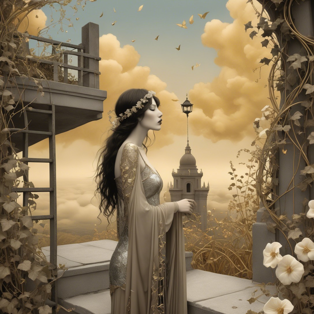 A woman in golden attire sits contemplatively by a vine-covered balcony, gazing towards a dreamy sepia-toned sky with clouds, birds, and a crescent moon.