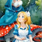 A whimsical scene featuring a curious young girl in a blue dress sitting on a giant mushroom, while an elderly man with a pipe watches her thoughtfully amidst a lush, enchanted forest.