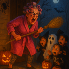 Prompt: A humorous and burlesque illustration of an old lady in curlers and a pink bathrobe, half-open to suggest that she is almost naked. She holds a broom angrily and suddenly opens the door of her house to chase away a group of children who have come to ask for candy for Halloween. The children, dressed as little monsters, witches and vampires, recoil laughing or screaming in surprise. The scene takes place on the doorstep, decorated with pumpkins and cobwebs. Cartoonish and colorful style, comical atmosphere, expressive details, soft and golden Halloween evening light