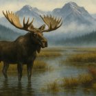 A majestic moose stands in a serene wetland, surrounded by vibrant autumn foliage and towering mountains in the background, creating a tranquil and picturesque natural scene...