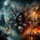 A dramatic fantasy scene featuring multiple stylized skulls, swords, and spears. Dark figures in the foreground suggest a battle, with ominous clouds and glowing elements enhancing the atmosphere.