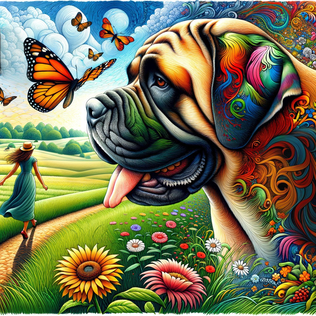 A vibrant artwork featuring a stylized dog with colorful patterns, amidst a whimsical landscape with butterflies and a figure in the distance.