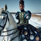 A regal figure rides a white horse in a winter landscape, wearing an exquisite gown adorned with cosmic patterns, featuring voluminous sleeves and intricate detailing, against majestic mountains.