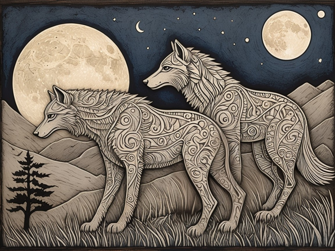 Two intricately designed wolves against a night sky, The wolves feature swirling patterns, nature and artistry combined..