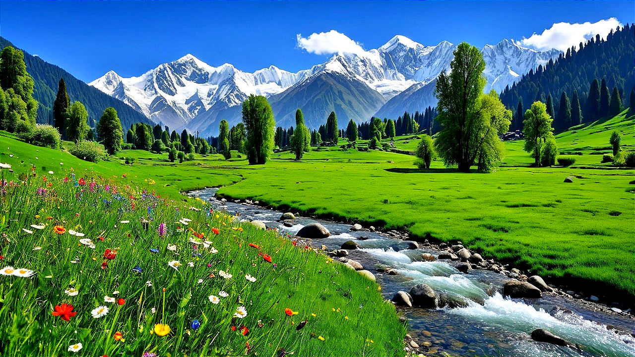 A serene landscape showcases lush green fields dotted with vibrant flowers, a gentle stream flowing through, and majestic snow-capped mountains under a clear blue sky. Nature's beauty at its finest!