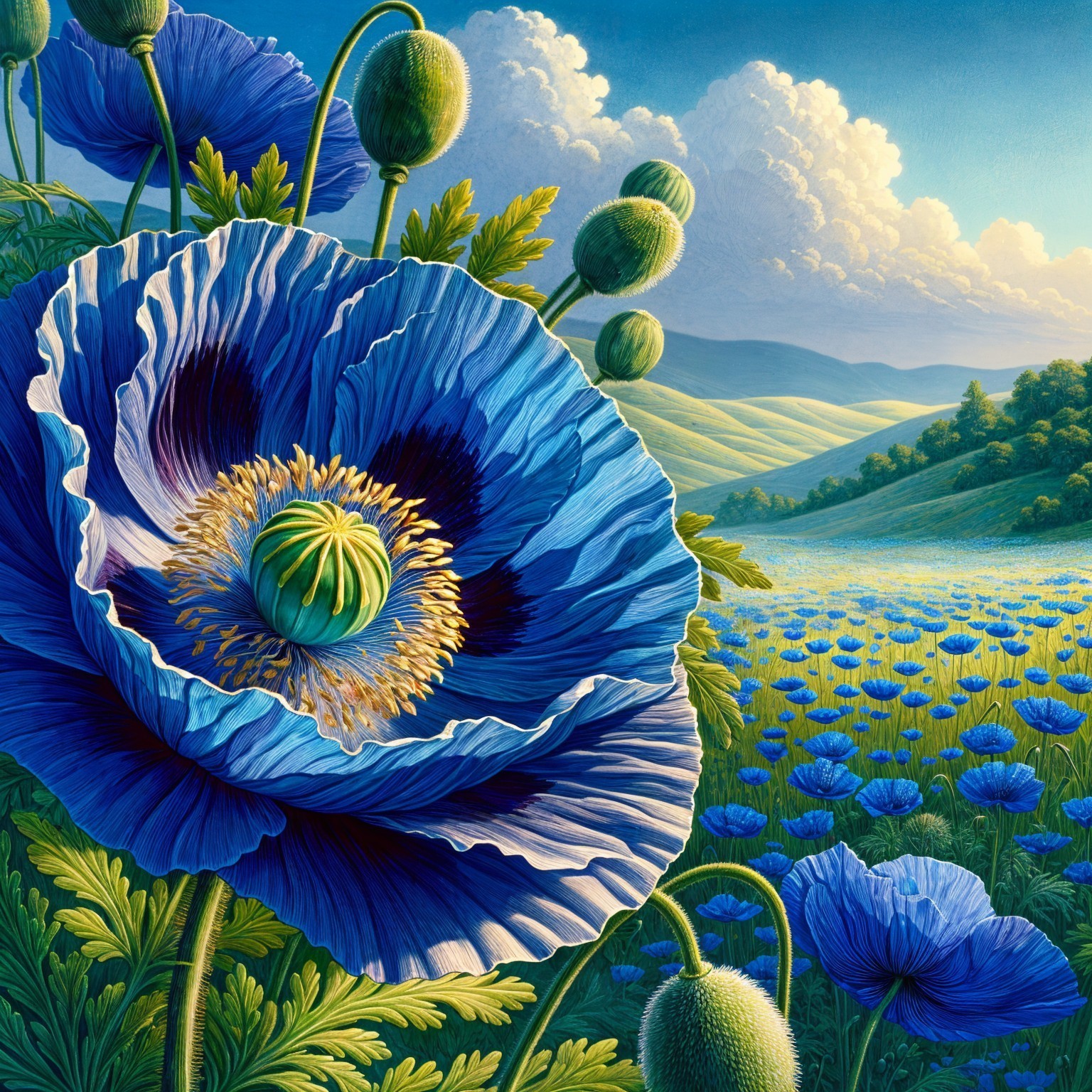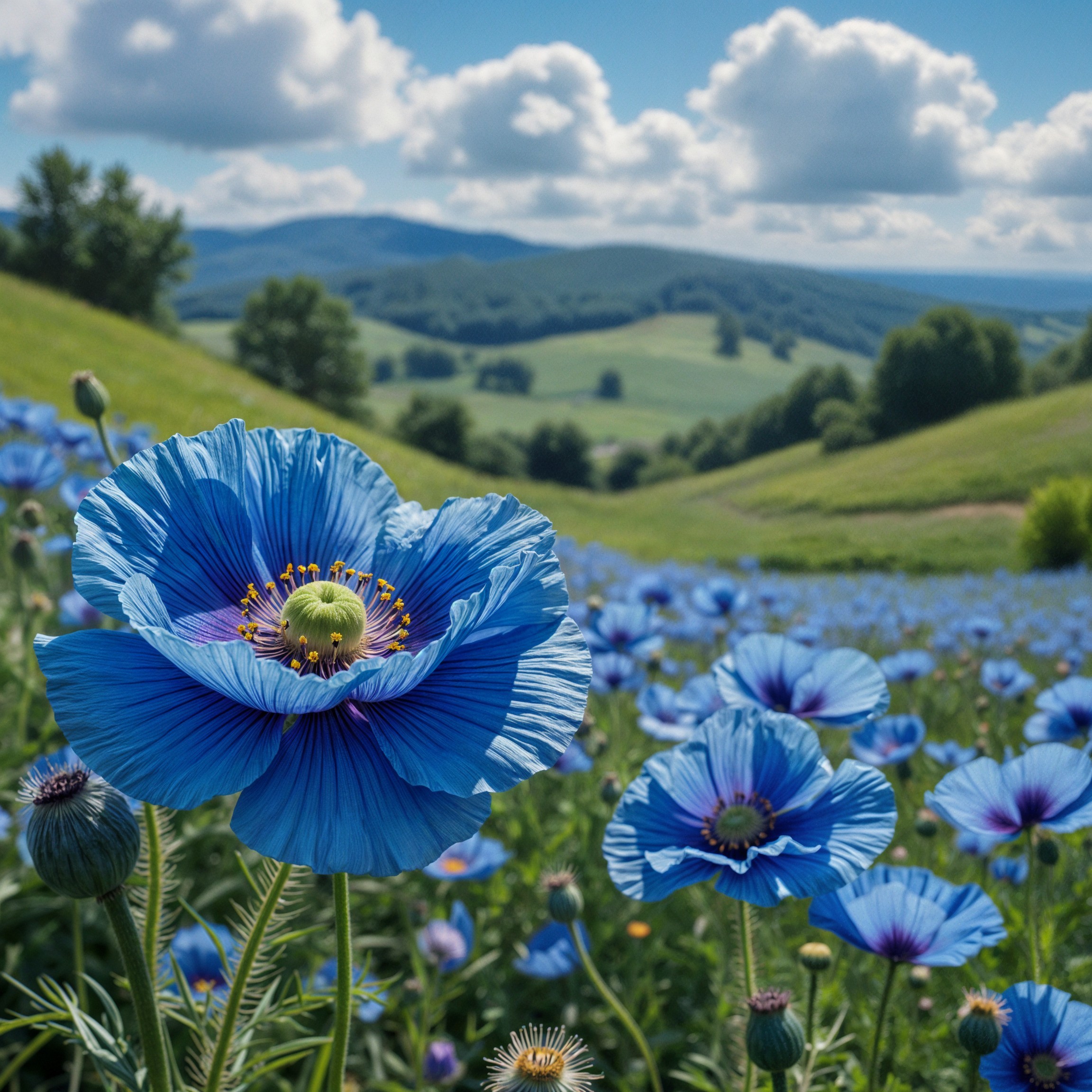 A vibrant blue poppy stands tall in a lush field, surrounded by more blooming flowers under a bright sky. The landscape features rolling hills and fluffy white clouds, creating a serene atmosphere.