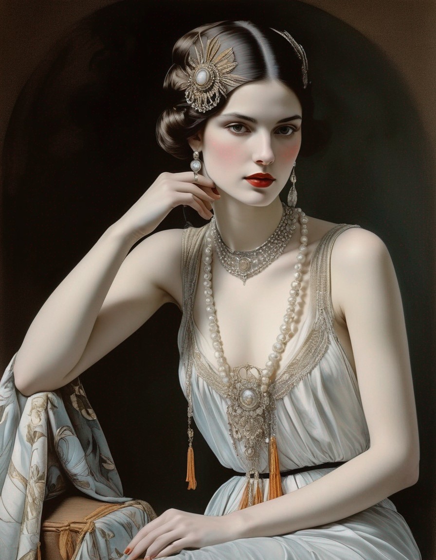 high priestess of high fashion. colored ink drawing, watercolor artwork on old withered paper, vintage, by Caravaggio, Fragonard, Anton Pieck, pale colors, high detail, intricately detailed, hyperdetailed volumetric lighting, art nouveau graphic steampunk