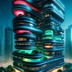A futuristic urban landscape features sleek, wavy structures illuminated by vibrant neon lights. Lush greenery lines a pathway, creating a striking contrast against the modern architecture in a misty atmosphere.