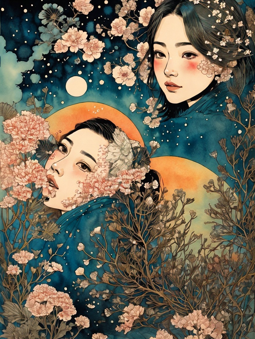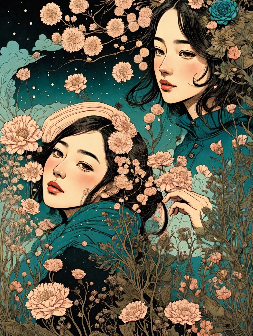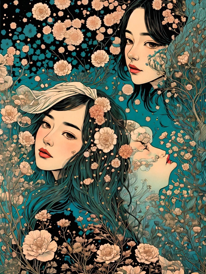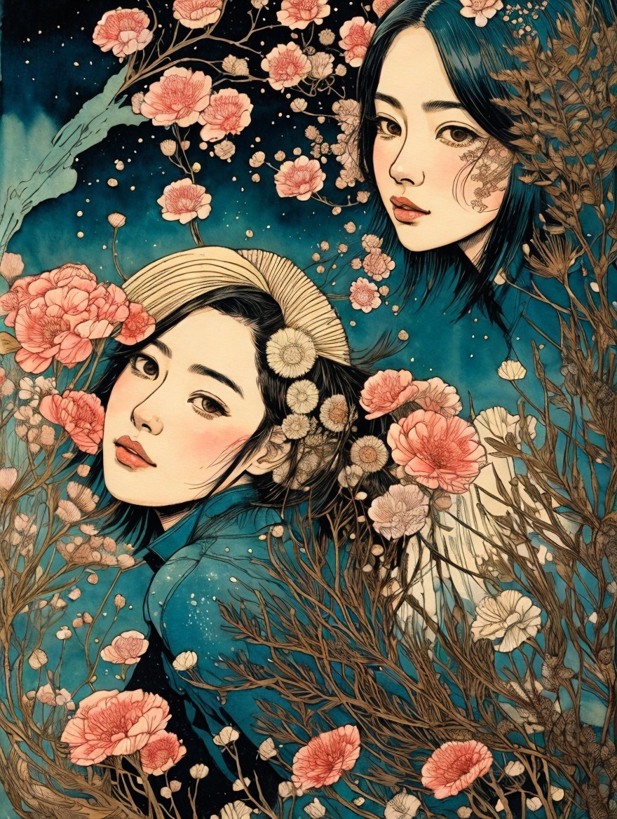 Three sisters, astral travellers, amidst floral patterns in an unknown universe.