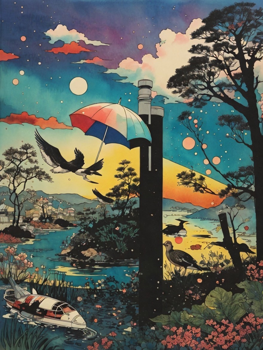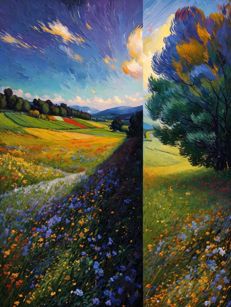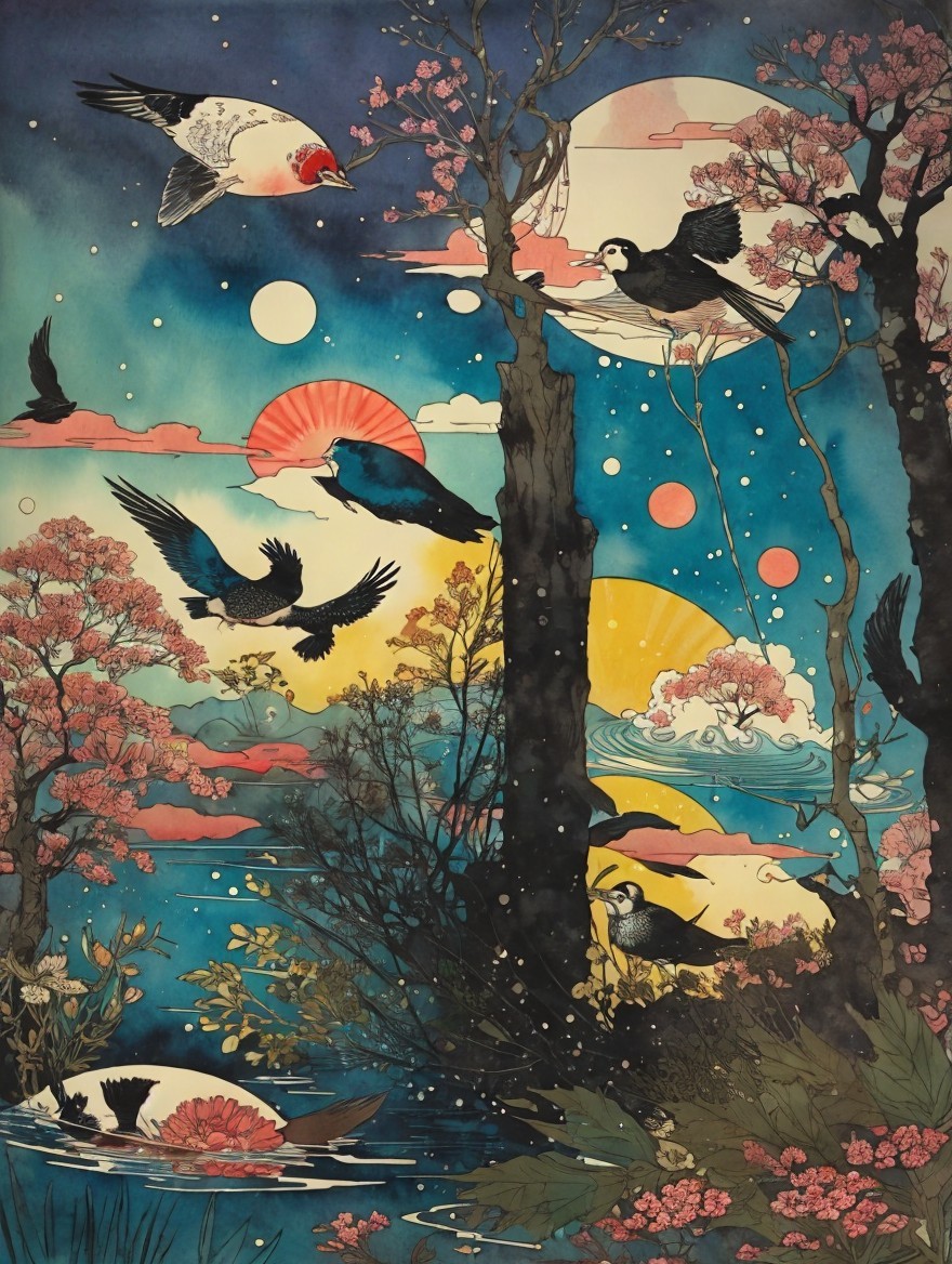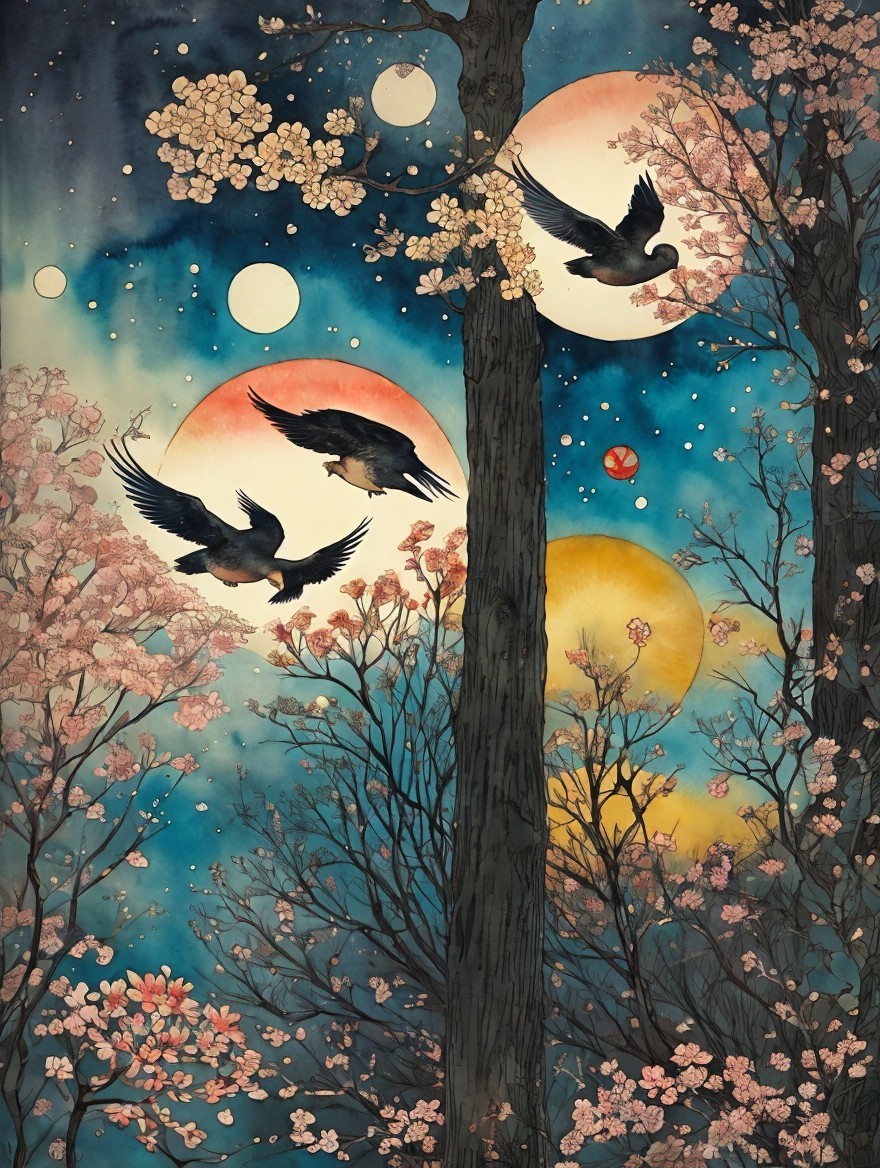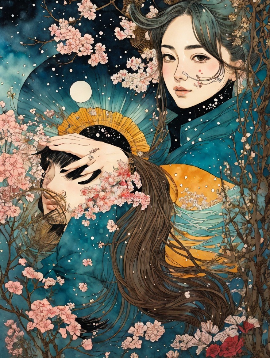 Three sisters, astral travellers, amidst floral patterns in an unknown universe.
