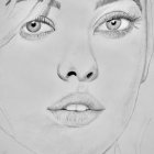 A monochrome sketch of a woman’s face featuring large, expressive eyes and delicate features. The lines are clean, highlighting her serene expression with a minimalist style.