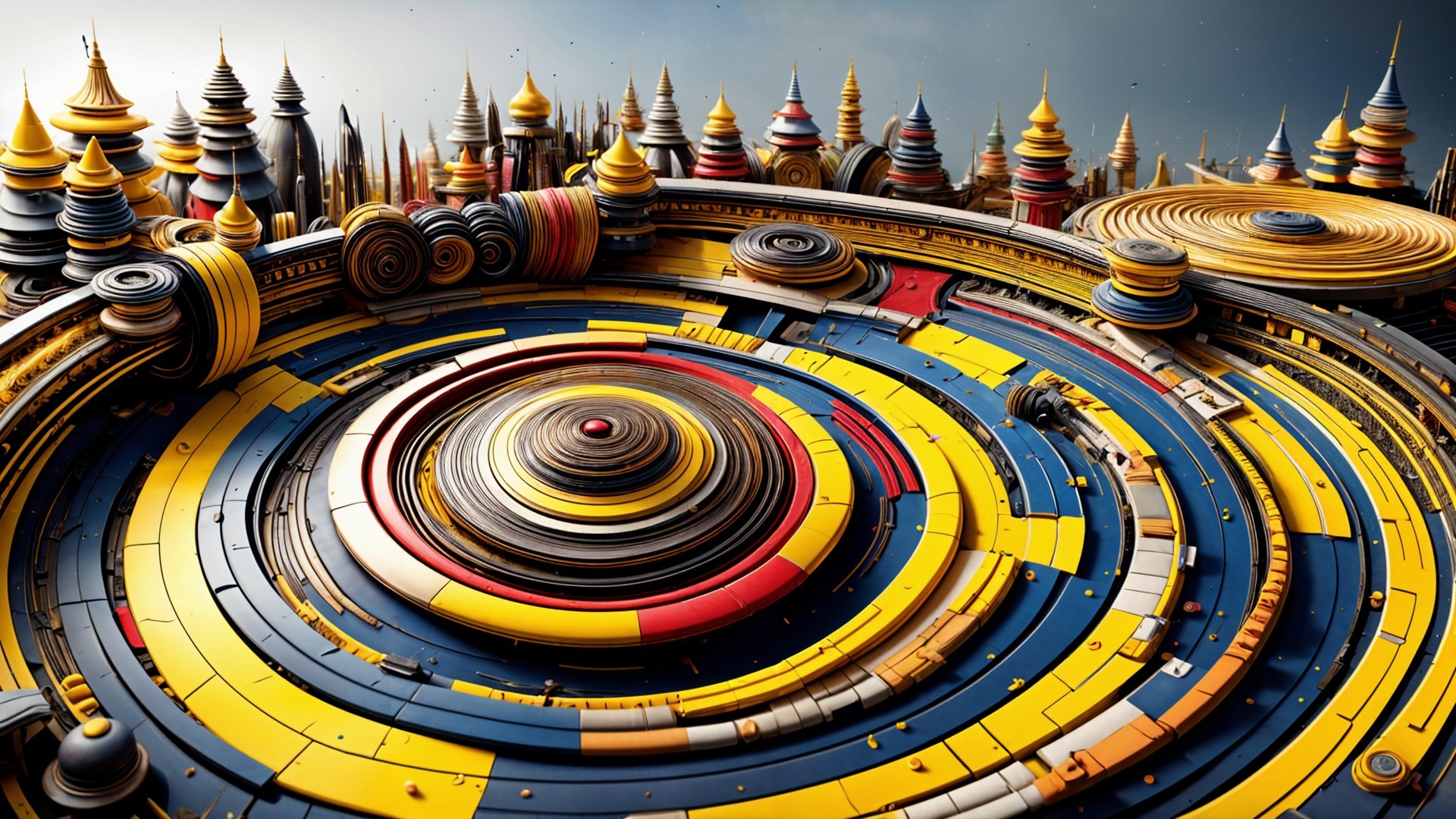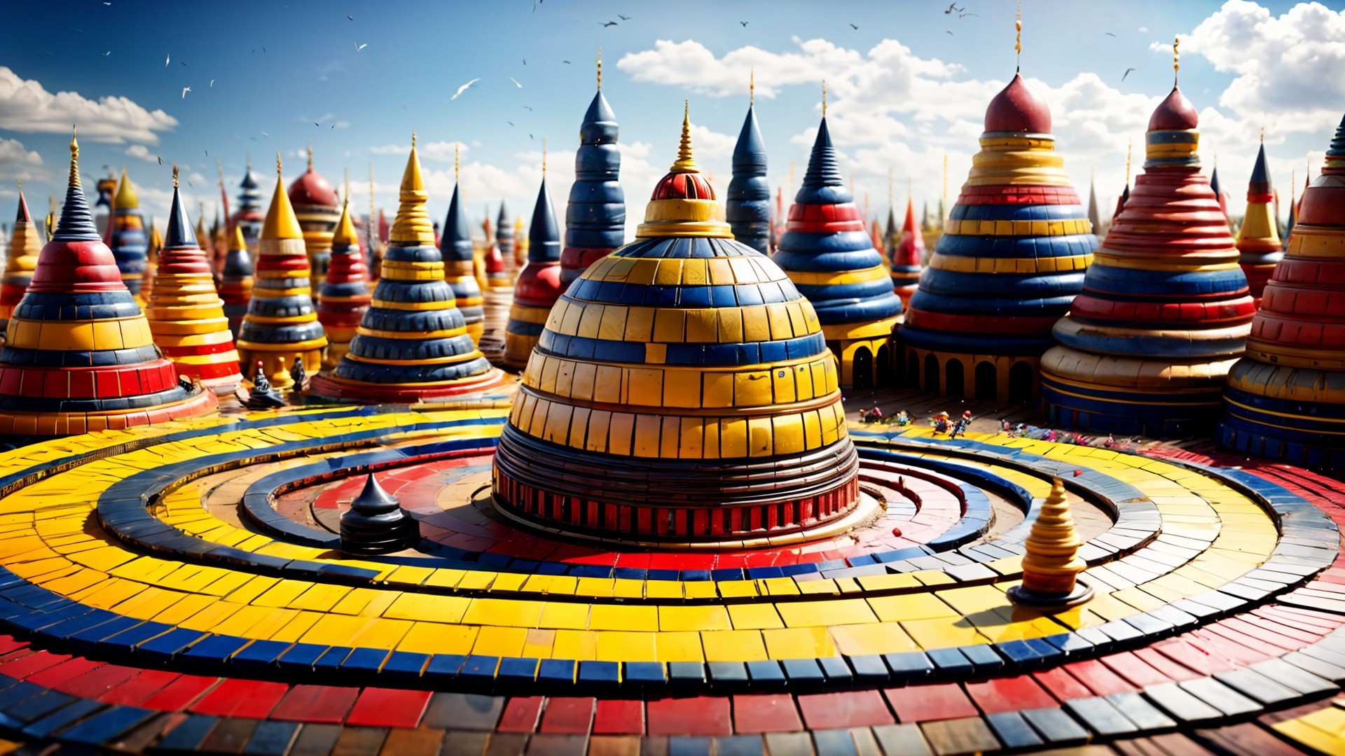 A vibrant, whimsical landscape features colorful, fairy-tale-like structures with pointed roofs. Children joyfully run along a bright mosaic path under a blue sky with scattered clouds.