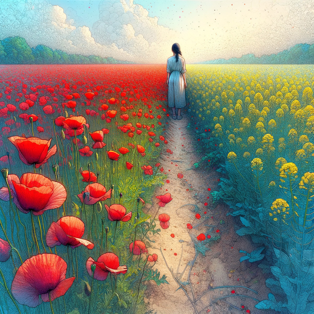 Beautiful summer is here. Beautiful Pale blue sky.Beautiful Red poppies sprout out of nowhere. the farmland is full of beautiful flowering yellow oilseed rape, that grow as tall as young girl. There is a path running through these. sharp focus elegant extremely detailed intricate 8k dynamic lighting fantastic view beautiful lighting pencil sketch watercolor LNF