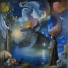 Mystical Scene by Serene Waterway with Enchanted Wildlife