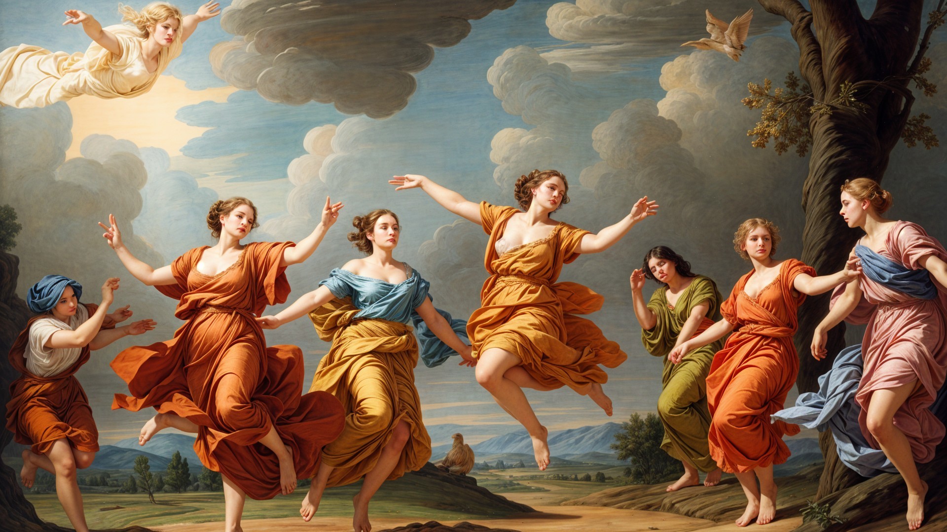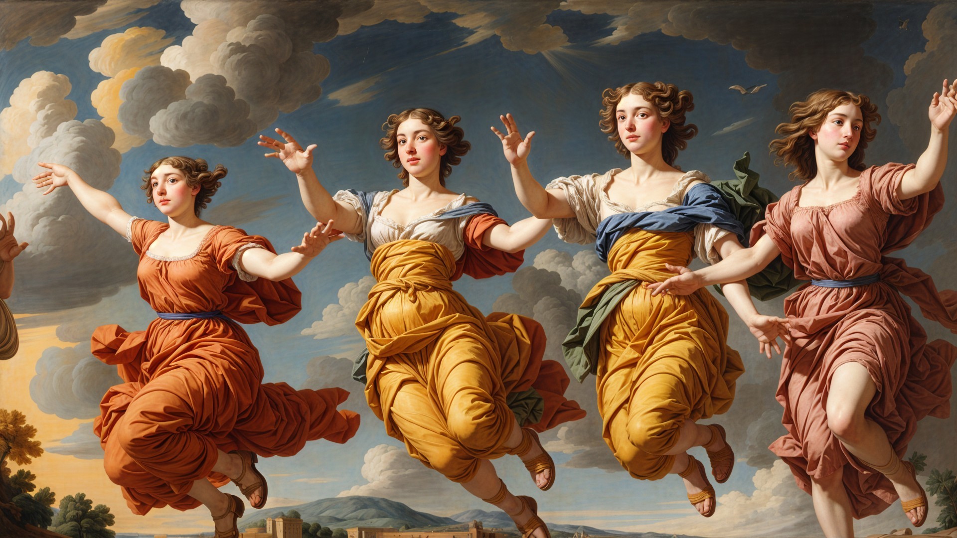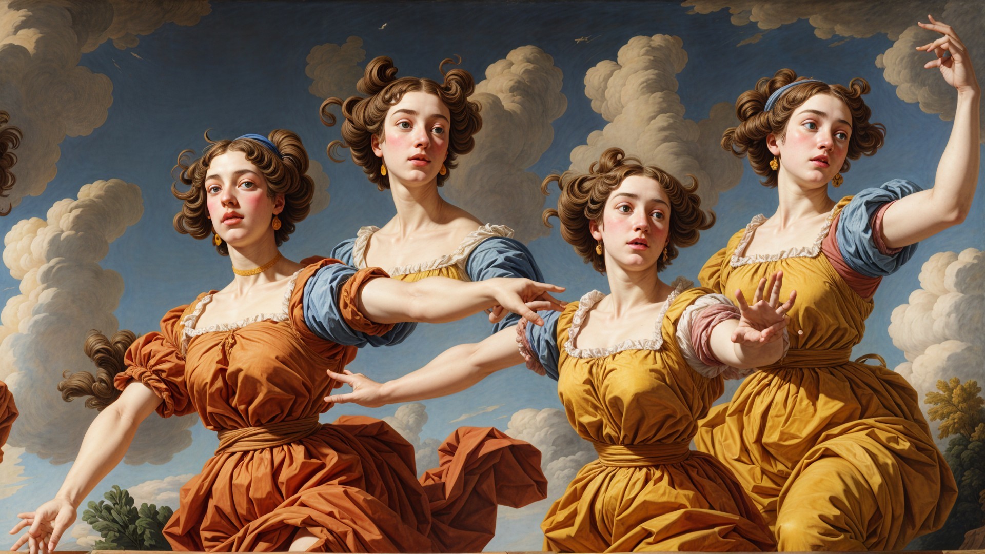 The image features a series of four women in vibrant historical dresses, showcasing different poses against a dreamy sky backdrop. Their expressions convey a blend of curiosity and motion. Note: One of the things that I find just a bit annoying is that Deep Dream insists on making the multiple faces in it's images nearly identical, as seems to be the case here. Mind you, my facial recognition is relatively poor so they may be more different than I think they are.