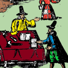 The image features a whimsical Halloween scene with three characters: a skeleton in a yellow coat, a cloaked figure in green, and another in a red costume, all holding pumpkins against a rural backdrop.