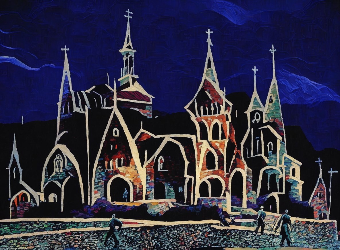 + Prompt:Oil painting, sneaking men in the starry night, sneaking men, old colorful village,houses, ornate towers, churches, factories, temples, windows, in the foreground branches, rocks, stones and dry high grass, behind hills in the haze, highly detailed, inspired by Umberto Boccioni