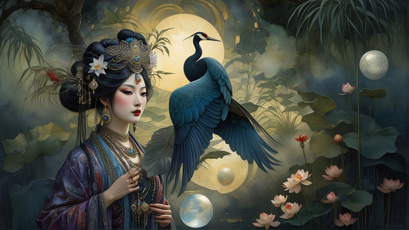 A serene woman in traditional attire holds a globe, standing among lotus flowers. A majestic crane perches nearby, set against a golden moonlit backdrop, evoking a harmonious blend of nature and culture.