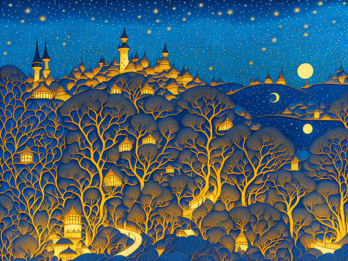 Prompt: Intricate detailed artistic drawing of a starry night full of bright stars over a dark blue sky, extremely-ultra-detailed line-art, in style of Aubrey Beardsley and Paul Corfield and George Callaghan, by Ivan Bilibin, flat color, dirty color, cold tones
