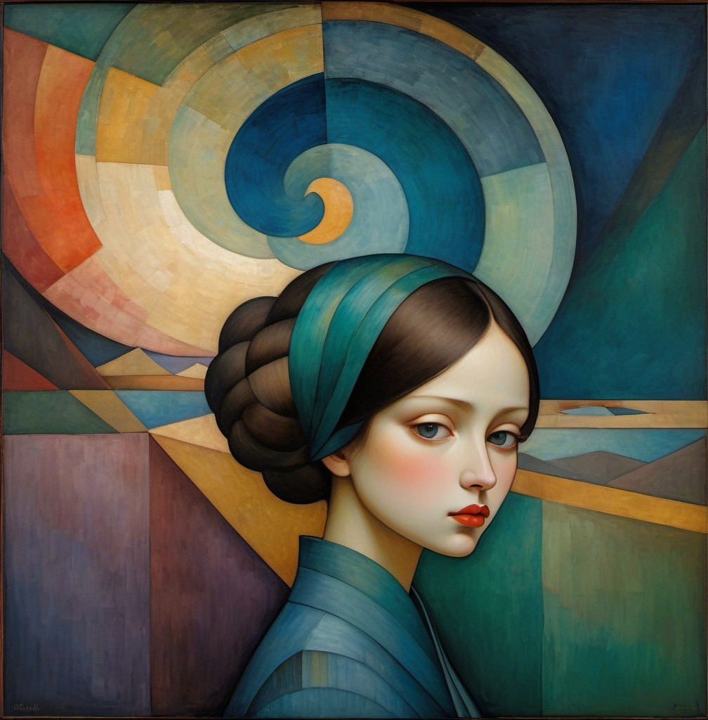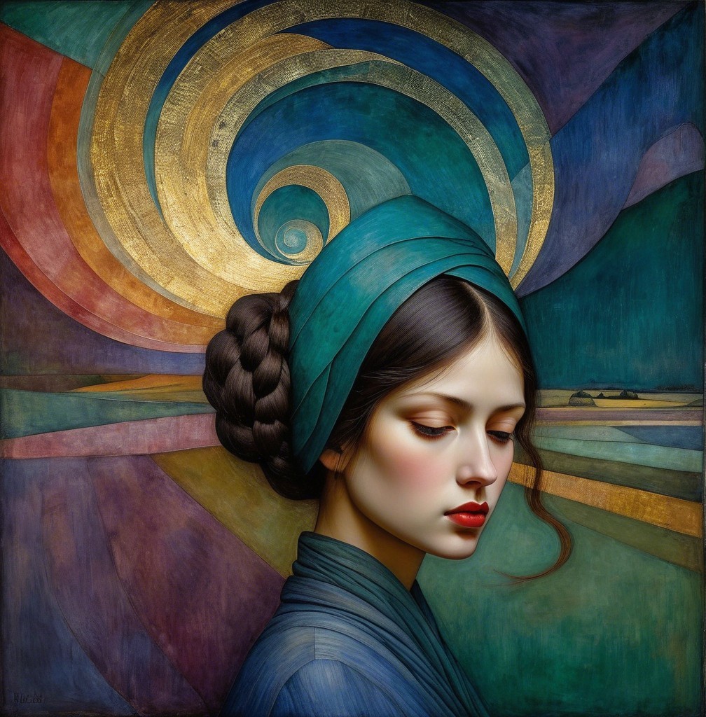 The image features a stylized portrait of a woman with serene expression, surrounded by geometric shapes and a vibrant color palette, blending shades of blue, orange, and green.