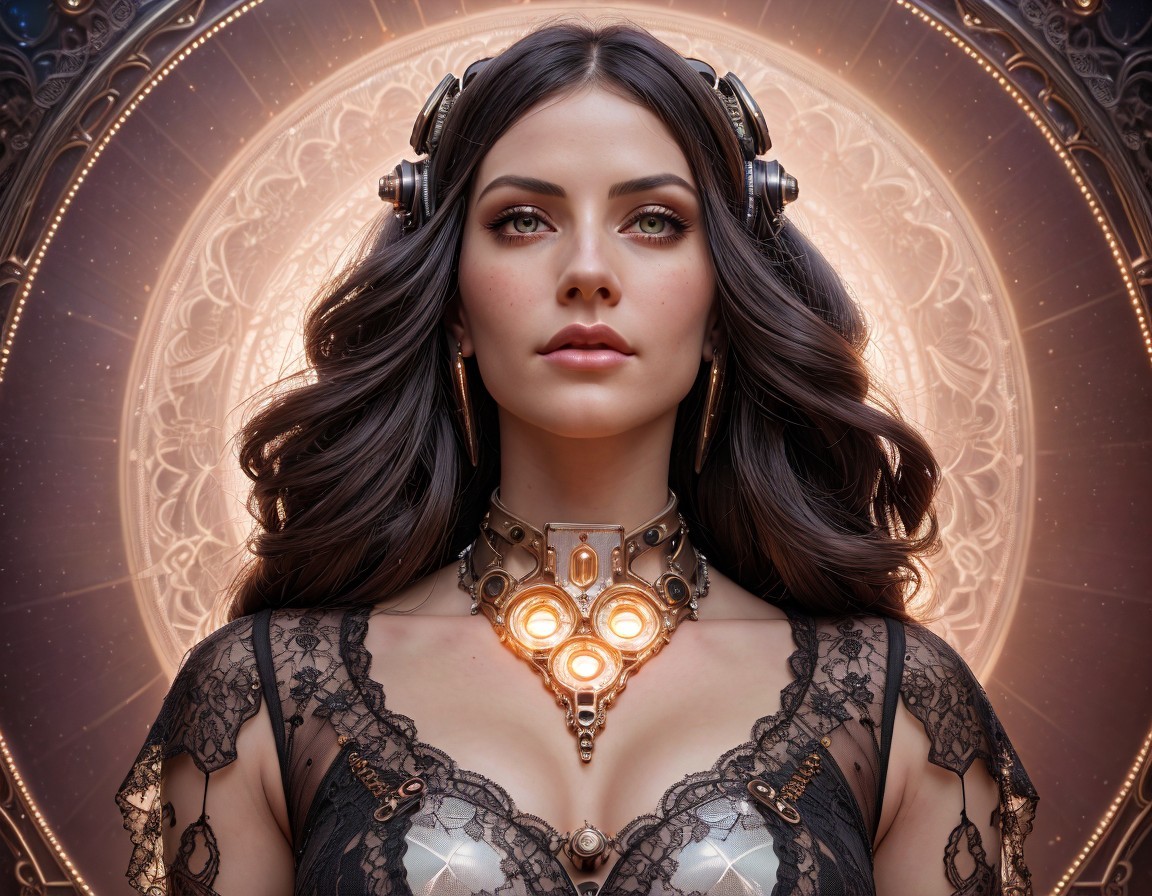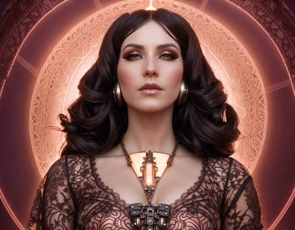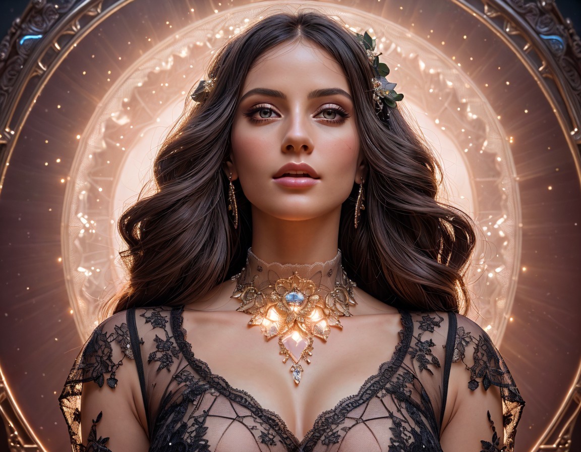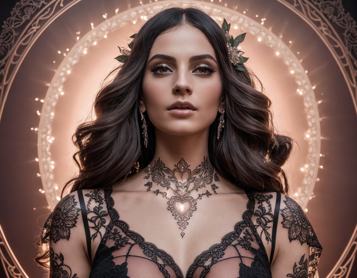 Dark-haired woman in lace attire with floral adornment and heart pendant in ornate circular frame.