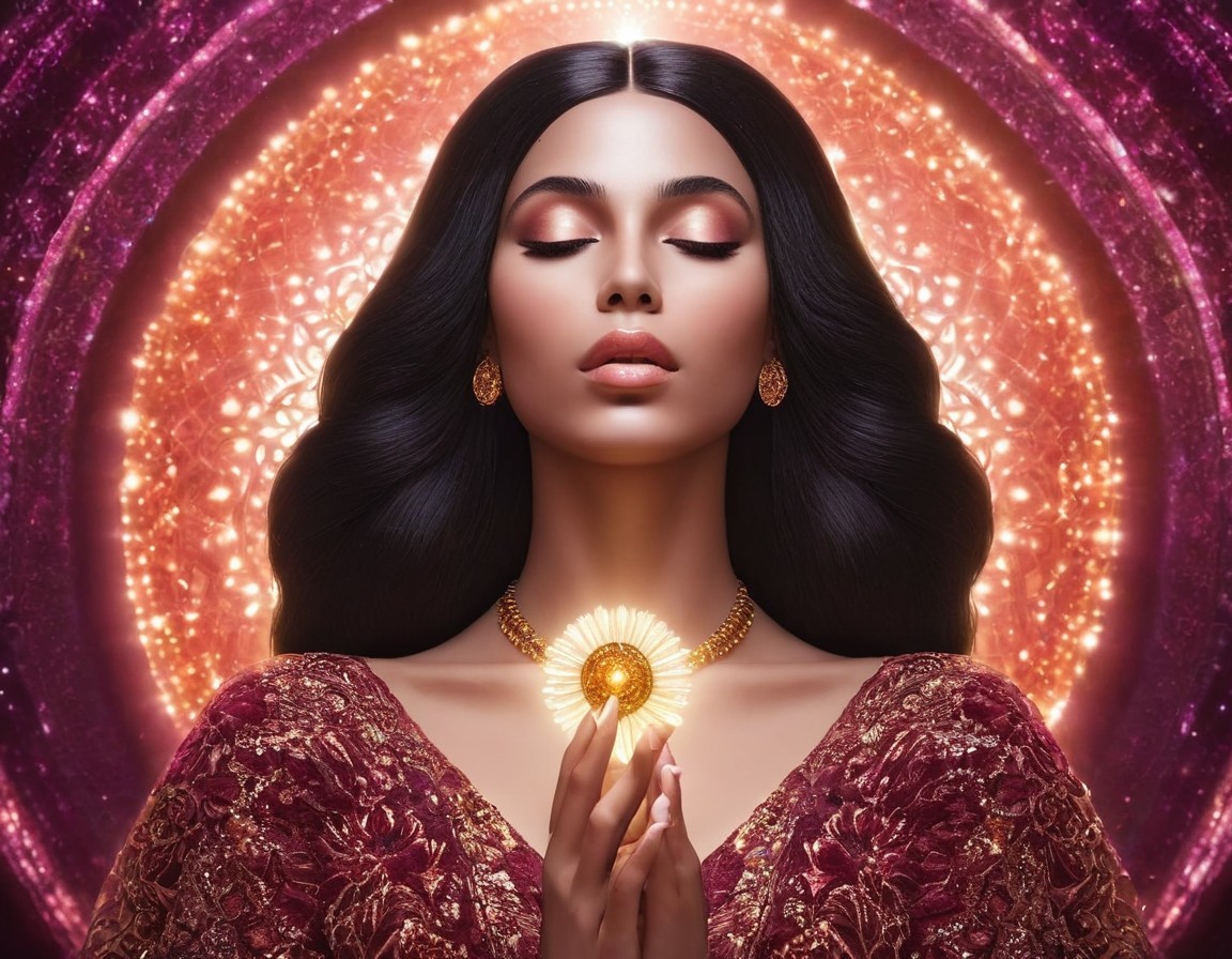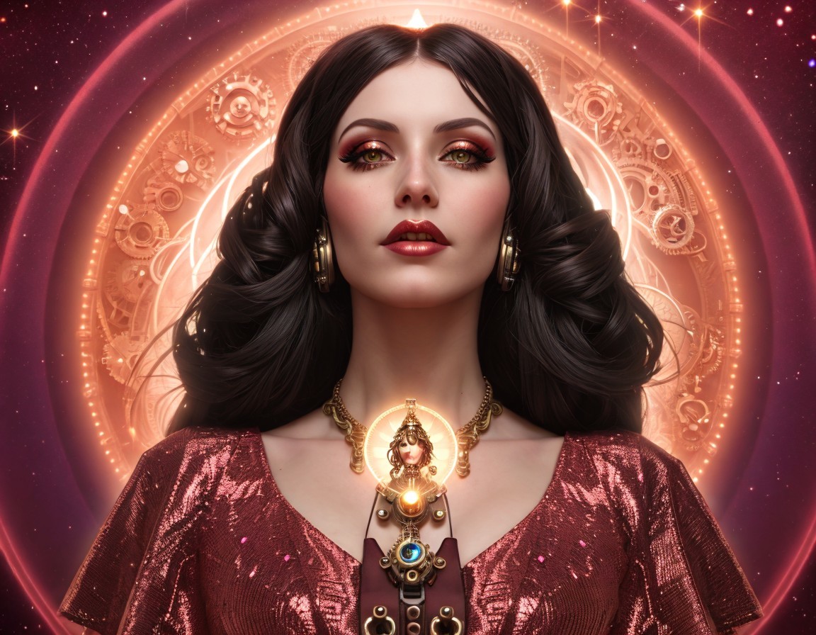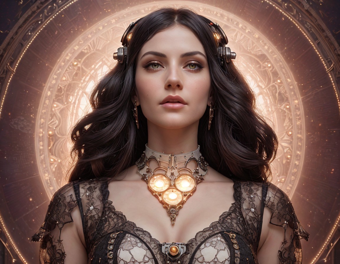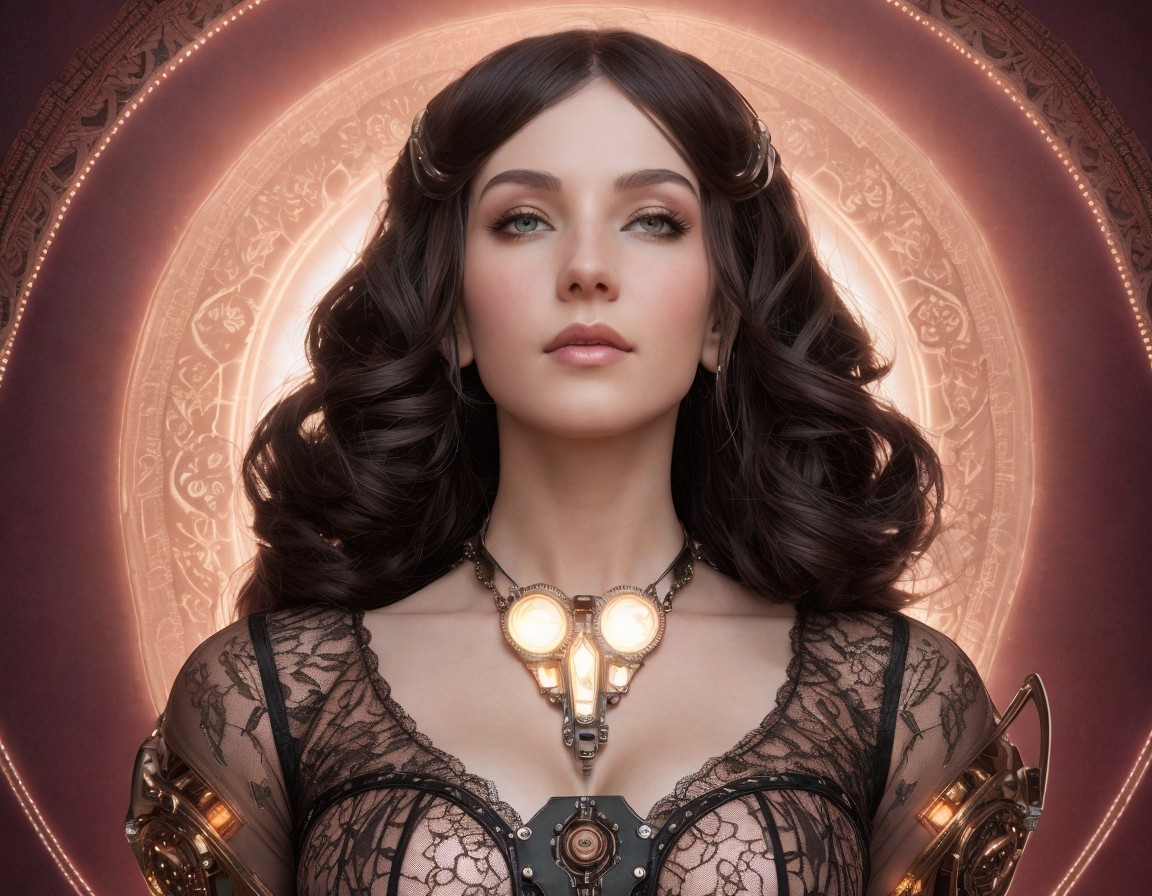 Dark-haired woman in lace attire with floral adornment and heart pendant in ornate circular frame.