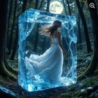 A woman in a flowing white gown stands inside a translucent ice block, surrounded by a misty forest. A full moon illuminates the scene, creating an ethereal and mystical atmosphere.