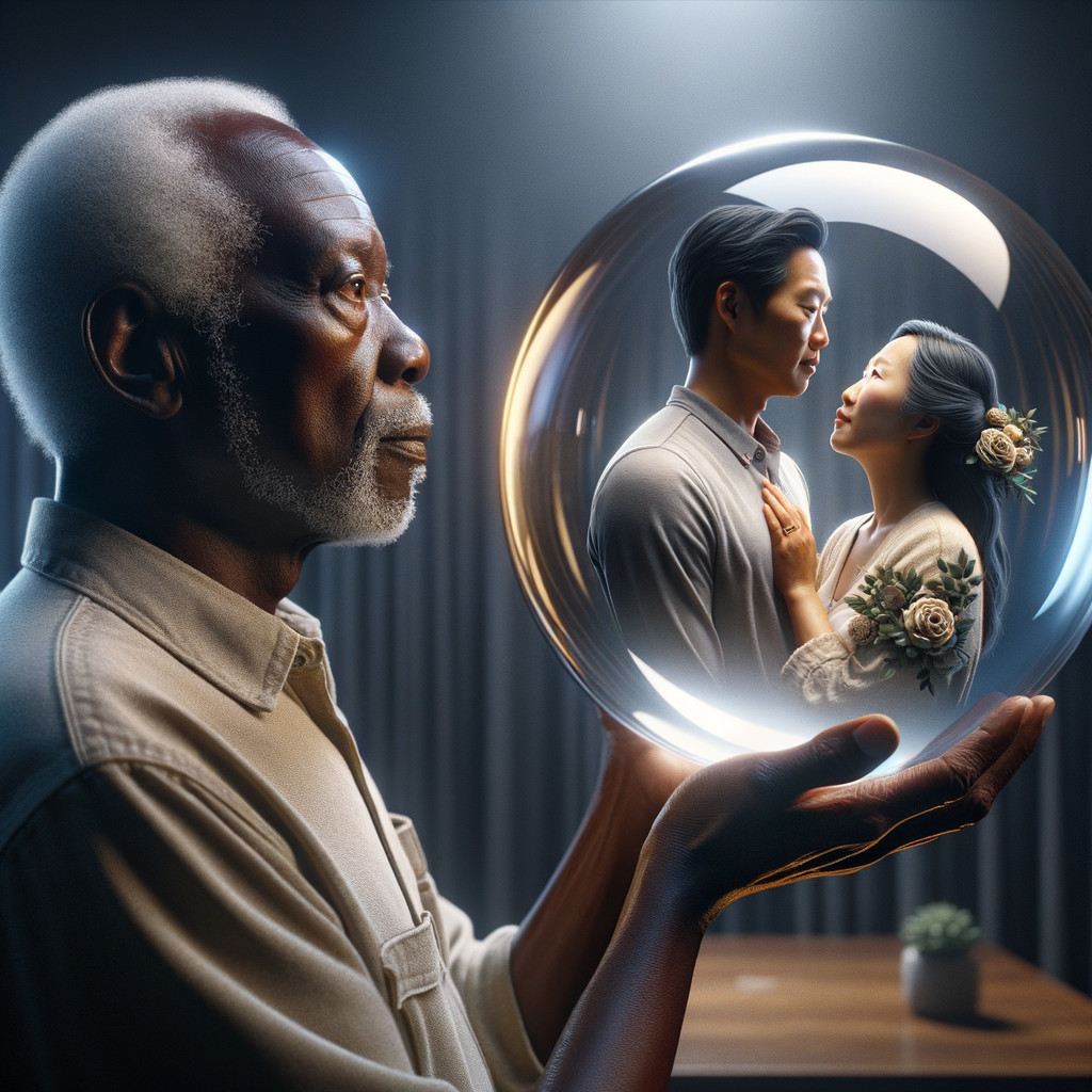 Elderly Man with Sphere Reflecting Young Couple's Affection