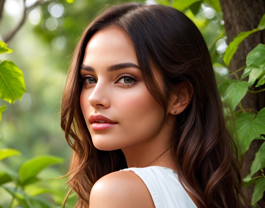 Dark-haired woman with brown eyes outdoors, smiling at the camera