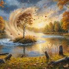 A solitary tree with swirling leaves stands on a small island surrounded by a tranquil river. Vibrant autumn colors reflect on the water, as the sun sets behind a serene, cloudy sky.